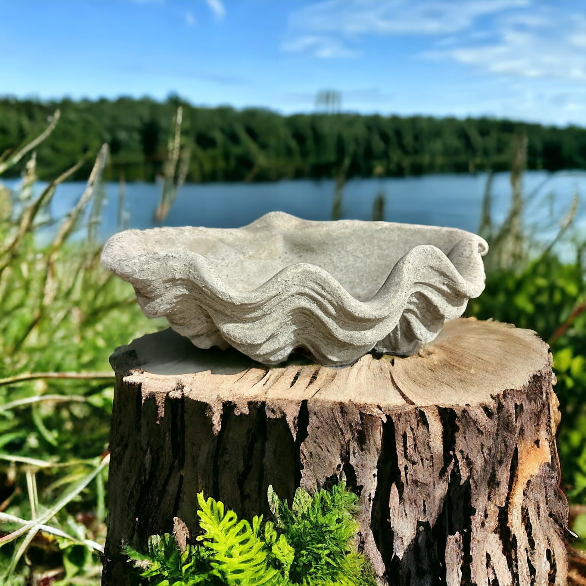 - Handgefertigte Vogeltränke in Muschelform aus frostresistentem Beton in eigener Produktion